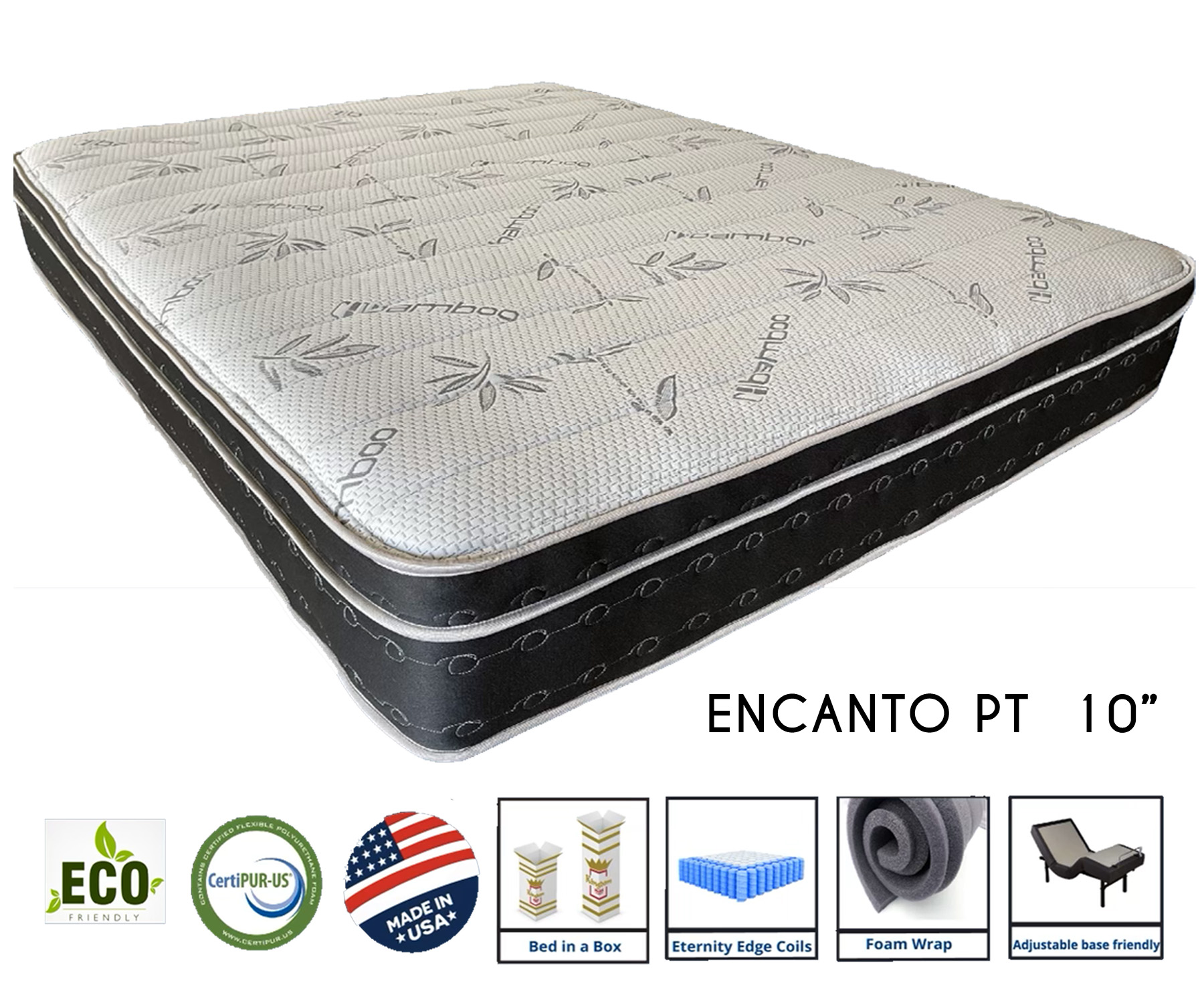 The Encanto PT 10” Mattress offers enhanced support with Eternity Edge Coils and foam wrap technology. Its eco-friendly design includes adjustable base compatibility and bed-in-a-box convenience, providing a balance of comfort and durability.