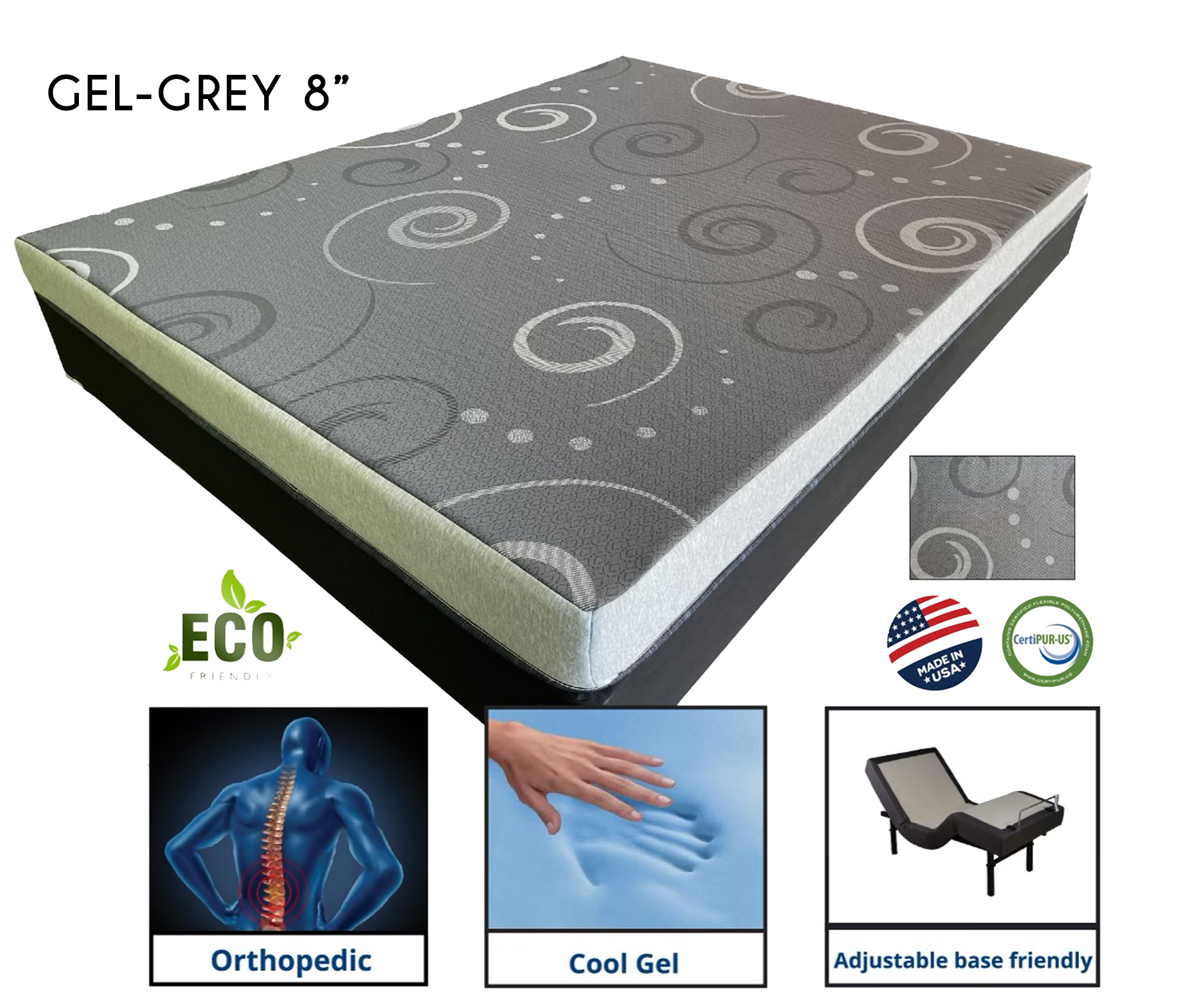 Experience ultimate comfort with the Gel-Grey 8” Orthopedic Mattress, designed for superior support and cooling. Featuring eco-friendly materials, this mattress is made in the USA and CertiPUR-US certified, ensuring quality and safety. The cooling gel layer regulates temperature, while the orthopedic design provides excellent spinal support. Compatible with adjustable bases, this mattress adapts to your lifestyle, making it perfect for a restful night’s sleep.