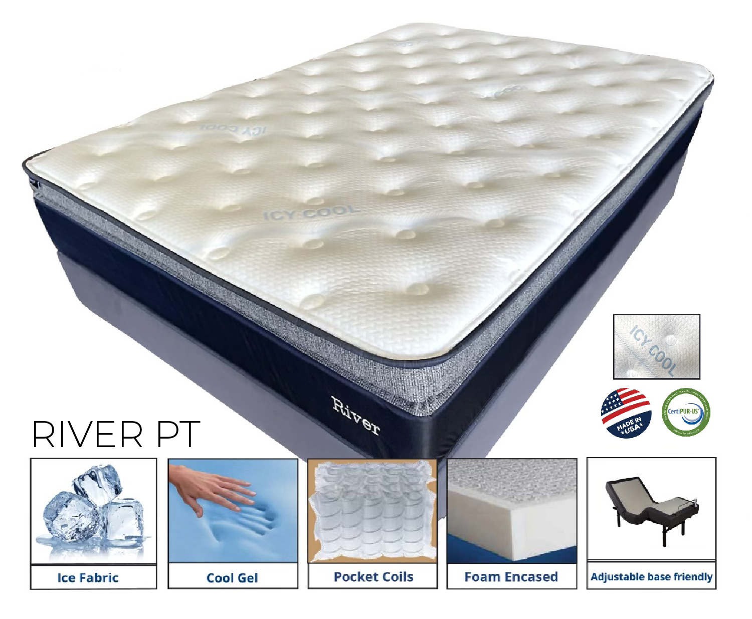 Experience luxurious comfort with the River PT Mattress, featuring ice fabric and cool gel for optimal cooling. The pocket coil design provides superior support, while the foam encasing enhances durability. This mattress is adjustable base friendly, making it perfect for any sleep setup.